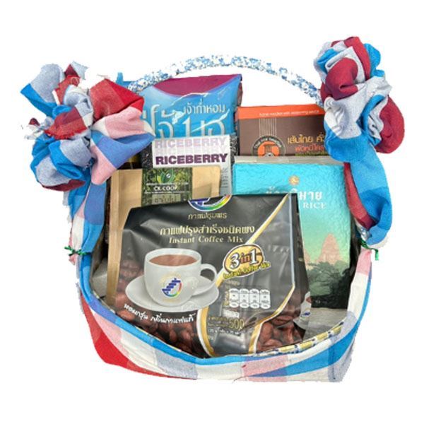 ประกอบด้วย ข้าวก่ำหอมแม่โจ้ 1กก.,ข้าวไรซ์เบอรี่ 1 กก.,ข้าวหอมมะลิพิมาย 1 กก.,เส้นไทยคั่วหมี่ 1 กล่อง,กาแฟ3in1 1 ห่อ,ชาใบไผ่ 1 ถุง, พร้อมกระเช้า และ ผ้าขาวม้าผูกกระเช้า 1 ผืน