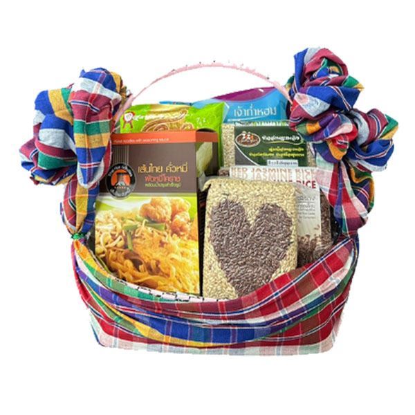 ประกอบด้วย ข้าวสามสีอินทรีย์ 1 กก.,ข้าวก่ำหอมแม่โจ้ 1 กก.,ข้าวหอมมะลิบุรีรัมย์1 กก.,เส้นไทยคั่วหมี่ 1 กล่อง,ข้าวหอมมะลิแดง 1 กก.,ข้าวหัวใจ 500 กรัม พร้อมกระเช้า และ ผ้าขาวม้าผูกกระเช้า 1 ผืน